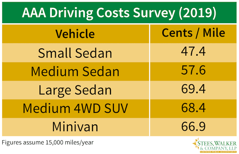 However, using the easy method could cost you money. Every year, the American Automobile Association (AAA or more commonly “Triple A”) conducts in-depth research into vehicle operating costs. If you’re choosing to take the standard deduction for a vehicle that costs more than 57.5 cents/mile, could be losing money by not claiming your actual expenses.