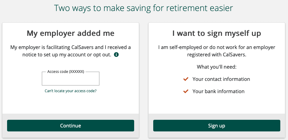 To get started, go to https://saver.calsavers.com/, click the Start saving button, and follow the onscreen prompts to enroll, as shown below. If you’re an employee, you can use your access code to log in or click Can’t locate your access code? to request one. If you’re self-employed, you can click the Sign up button to get started.