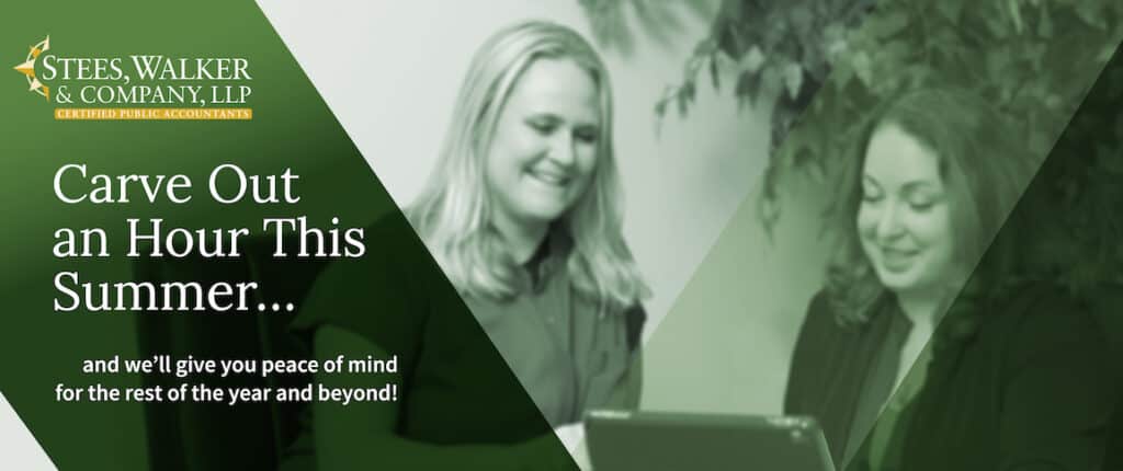 Here at Stees, Walker & Company, LLP, we make it our responsibility to help our clients navigate the complexities of personal and business finances and maximize their tax savings, so they have more money to enjoy their lives and invest toward their financial futures. To fulfill this deeply rooted responsibility, every year at about this time, we offer our clients a complementary mid-year planning meeting. During each one-hour session, we discuss the client’s goals and any changes to their personal and/or business lives, identify ways to help them save money on taxes, answer any questions they have, and ensure that we are all working together toward the same financial goals.